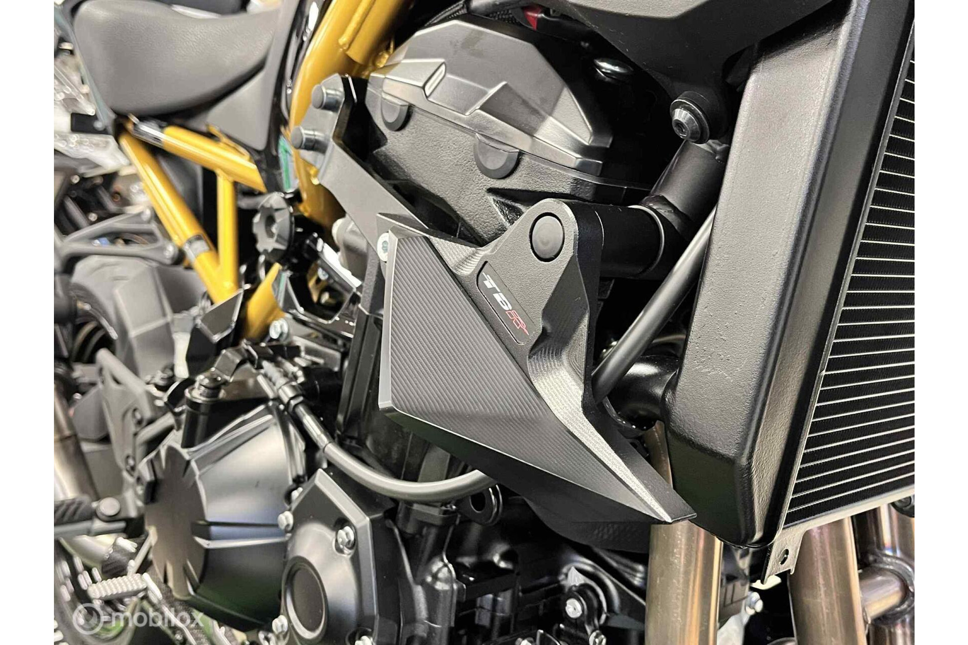SC-Project carbon demper met carbon heatshield, korte plaathouder, korte, zwarte & instelbare rem/koppelingshendel met matching goudkleurige versteller, subtiele Puig bar-end spiegels, TBRacing valbescherming etc. Te bezichtigen in de showroom, eventueel naar voorkeur verder te personaliseren. Leverbaar op 10 werkdagen!